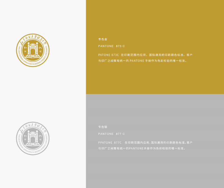 为使学校形象统一而富有变化,特规范特殊印刷工艺色进行配合应用。在特殊背景、特殊材料或特定要求下,标志、标准色可印烫金或者烫银。