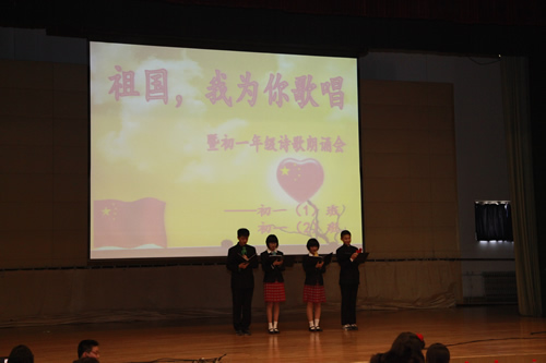2012年3月26日下午,我校初一年级全体师生成功举办了“祖国,我为你歌唱”诗歌朗诵会,整个礼堂洋溢着高涨的爱国情怀,充斥着选手们挥斥方遒的青春豪情。