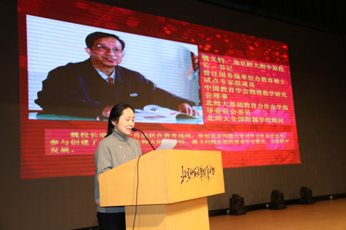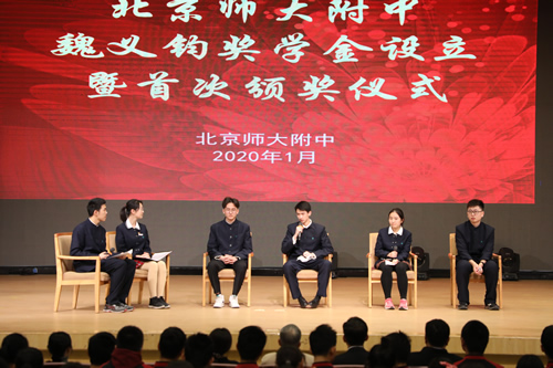 顾咏梅副校长向师生们介绍了魏义钧奖学金的来由。魏义钧奖学金是由我校一名1993届校友因感念附中的教育培养,感恩老师们的关怀帮助而捐资设立的,奖励在数学、物理、化学、生物、信息、科技(包括机器人)、体育等领域取得重大成绩的同学,希望籍此传递师大附中和魏义钧老校长教书育人、为国育才的精神,激励附中学子秉承“诚爱勤勇”的校训,刻苦学习,全面发展,早日成为祖国的栋梁。
