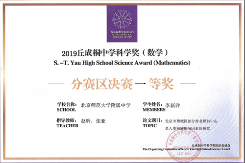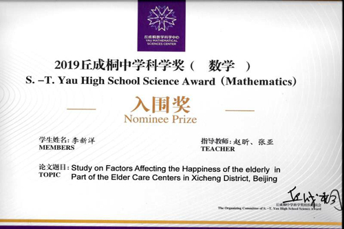 我校高二8班李新洋同学,凭借《北京市西城区部分养老照料中心老人幸福感影响因素的研究》项目,获得2019年丘成桐中学科学奖(数学)北方赛区决赛一等奖,并入围全球总决赛,这是近年来我校在竞赛方面取得的突破性成绩。指导教师为科技组赵昕、张亚老师,数学组常少杰老师。
