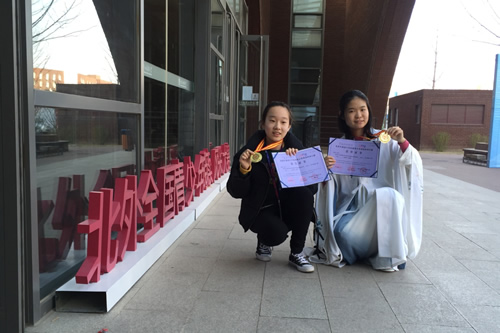 初赛、复赛表演曲目为《爱丽丝漫游仙境》,两位同学以标准的英文发音,生动的情景展示征服了评委们而获得团体组北京市一等奖。全国总决赛里的即兴表演短剧中,她们又以扎实的英文功底赢得在场专家评委的一致赞赏。在自选表演英文剧目中,她们大胆用英文表演京剧国粹《霸王别姬》,从创意、到英文翻译的准确、英语的发音、表演的情景展示与台风在现场的专家评委与观众中取得了轰动效应,被称为是教改方向的成功体现。这场既具国际视野,又饱含中国情怀的演出毫无争议的被评委一致推举为本届大赛团体组的金奖。而二位同学通过放弃一个学期和春节的休息时间来进行艰苦而专业的京剧训练,不仅在京剧史上首次以女扮男装的形式成功地反串霸王这一角色,更锻炼了锲而不舍的意志品质。