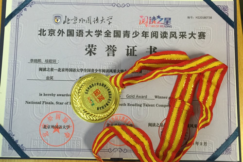 2018年3月6日初二年级学生李晓熙、桂载月参加了由北京外国语大学主办的北外全国青少年阅读风采全国大赛并荣获金奖。本届大赛自2017年9月启动,历时6个多月,在全国近100个赛区,近50万中小学生参赛。李晓熙、桂载月通过北京区初赛、复赛以北京市一等奖的身份进军全国总决赛。最终又在全国选拔出的1000多名选手的总决赛中脱颖而出,压倒式优势最终获得团体组金奖,为校争光。