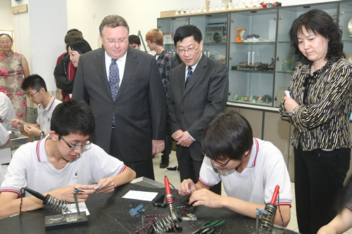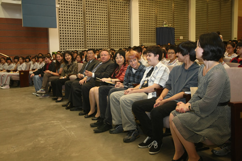 访问团一行深入课堂听课,观看了我校学生精彩的文艺演出,参观了美丽的校园,和我校师生进行了亲切交流。本杰明・富兰克林高中校长Rusnak博士为我校高一年级学生做了有关美国历史和教育的讲演,并诚挚邀请附中学子到美国学习交流。同学们听得兴趣盎然,并在提问环节和Rusnak博士进行深入互动。Rusnak校长对我校师生的高素质以及优秀的校园文化建设给予高度赞扬。