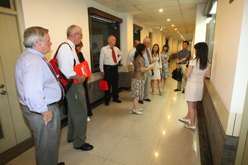 6月23日,美国康涅狄格州教育部长马可K.马奎兰先生和美国哈特福德大学校长沃尔特.哈里森先生等一行8人来我校参观访问,刘沪校长与客人们就中美教育现状等问题进行了深入的交谈,王莉萍副校长、外语组部分教师出席座谈,外宾们我校的学生素质和教学环境给予高度评价。中国教育国际交流协会林佐平副秘书长陪同外宾来我校访问。