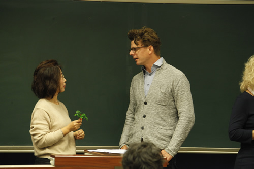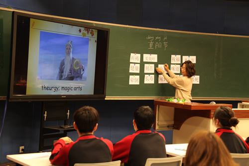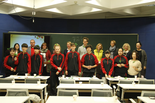 袁琳老师的汉语课是一节介绍重阳节的中国文化课。精心的课堂设计和热烈的学习气氛,使德国校长们对中国的节日文化也充满了兴趣。课后,我校德国留学生尼可同学向校长们介绍了他一个多月来的汉语学习情况和在北京的生活情况。