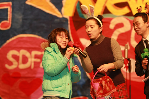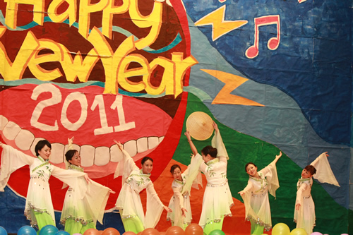 娱乐节目首先在校合唱团的天籁之声中拉开了序幕,完美的演唱使人如临幻境,心旷神怡;第二个由女教师们带来的歌舞表演《在水一方》节目更是温婉动人,情意绵绵,赢得了职工们的不断喝彩;第三个出场的节目校舞蹈团的获奖舞蹈――《鱼儿》为整台晚会奠定了高雅而欢愉的基调。接下去的节目更是形式多样,有小电影、舞台情景剧等,内容也相当丰富,既反映了教职工的真实生活与思考,又愉悦了大家使人身心放松。在约2小时的文艺表演过程中,校工会还穿插了令人兴奋的抽奖活动,但奖品并不是大家关注的焦点,重要的是被抽中的奖号象征着新年即将会有一个好运气。就这样在一片欢歌笑语中,在其乐融融中,北师大附中的教职员工们在喜庆而祥和的气氛中辞旧迎新。