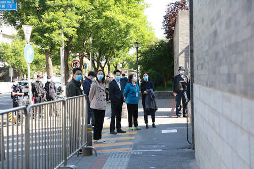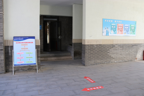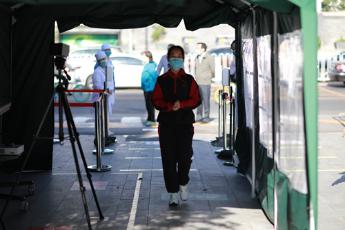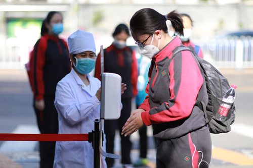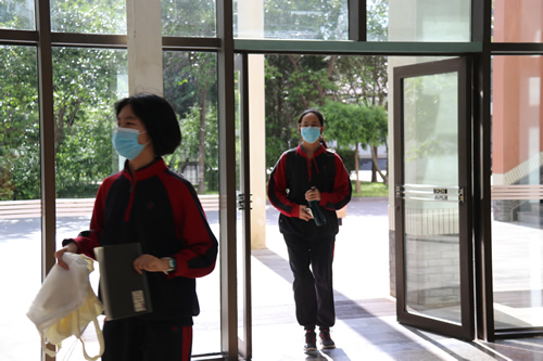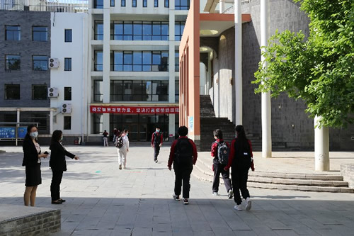 早晨7:00,老师们已经在校门口等待着同学们的归来。入校同学通过专属通道,经过消毒和红外测温棚进入校园。