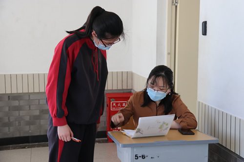 同学们有序的保持1米的间隔距离进入教学楼。在教室里,有的同学绘制欢迎归来的板报,有的同学自习,也有同学在找老师答疑。