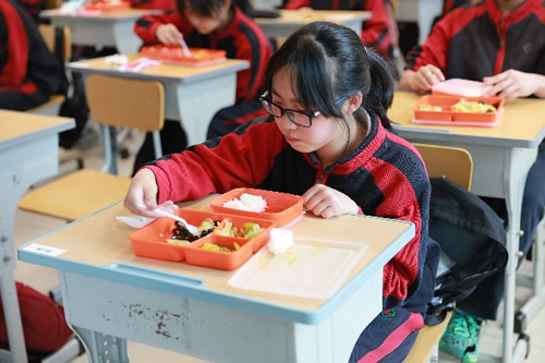 午饭时间,同学们有序的拿饭,在座位上安静的用餐。同时,班主任老师进行午间的体温测量。