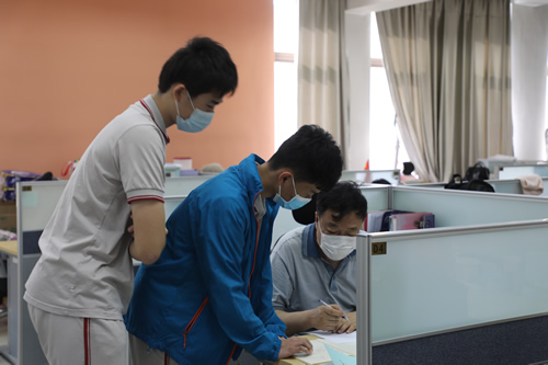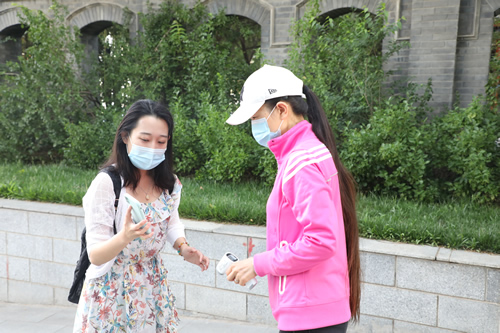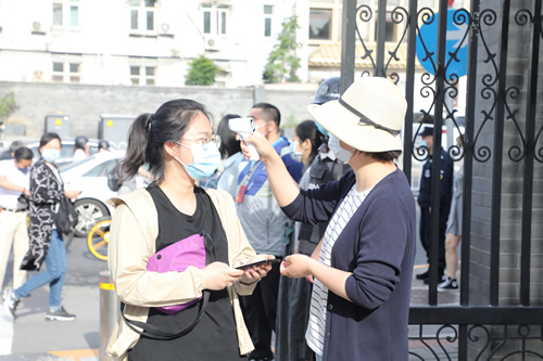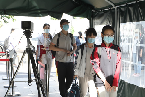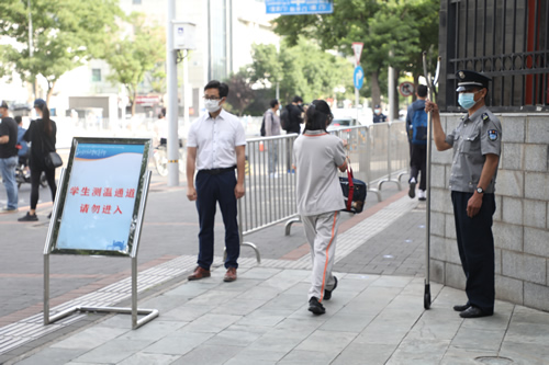 早7:00-8:30 同学们错时错峰,分批返校。校领导和学生处老师在校门口引导学生分批入校。教职工入校需出示健康宝并测量体温。学生入校需通过红外测温棚并消毒。