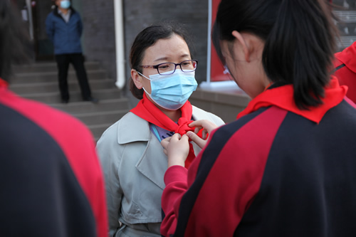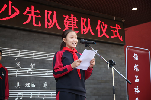 校长助理况莉宣布建队决定,任命大队辅导员、中队辅导员和中队长。伴着明快的音乐,少先队员代表为大队辅导员、中队辅导员佩戴红领巾。