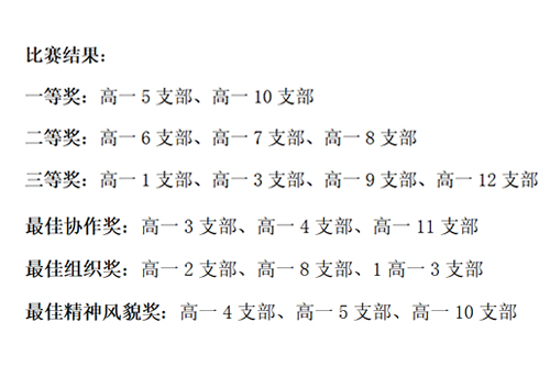 比赛在高一6支部的《听妈妈讲那过去的事情》歌声中开始,六支部的女生身着灰色民国连衣裙,男生身着中山装,同学们用诗一般的语言和妈妈诉说的口吻,带着礼堂中的同学一同重历旧中国的艰辛和新中国、新生活的来之不易。而后,他们以诗朗诵开启了《保卫黄河》的合唱,“黄河在咆哮,黄河在咆哮!”气势磅礴,响彻礼堂,赢得了阵阵掌声。