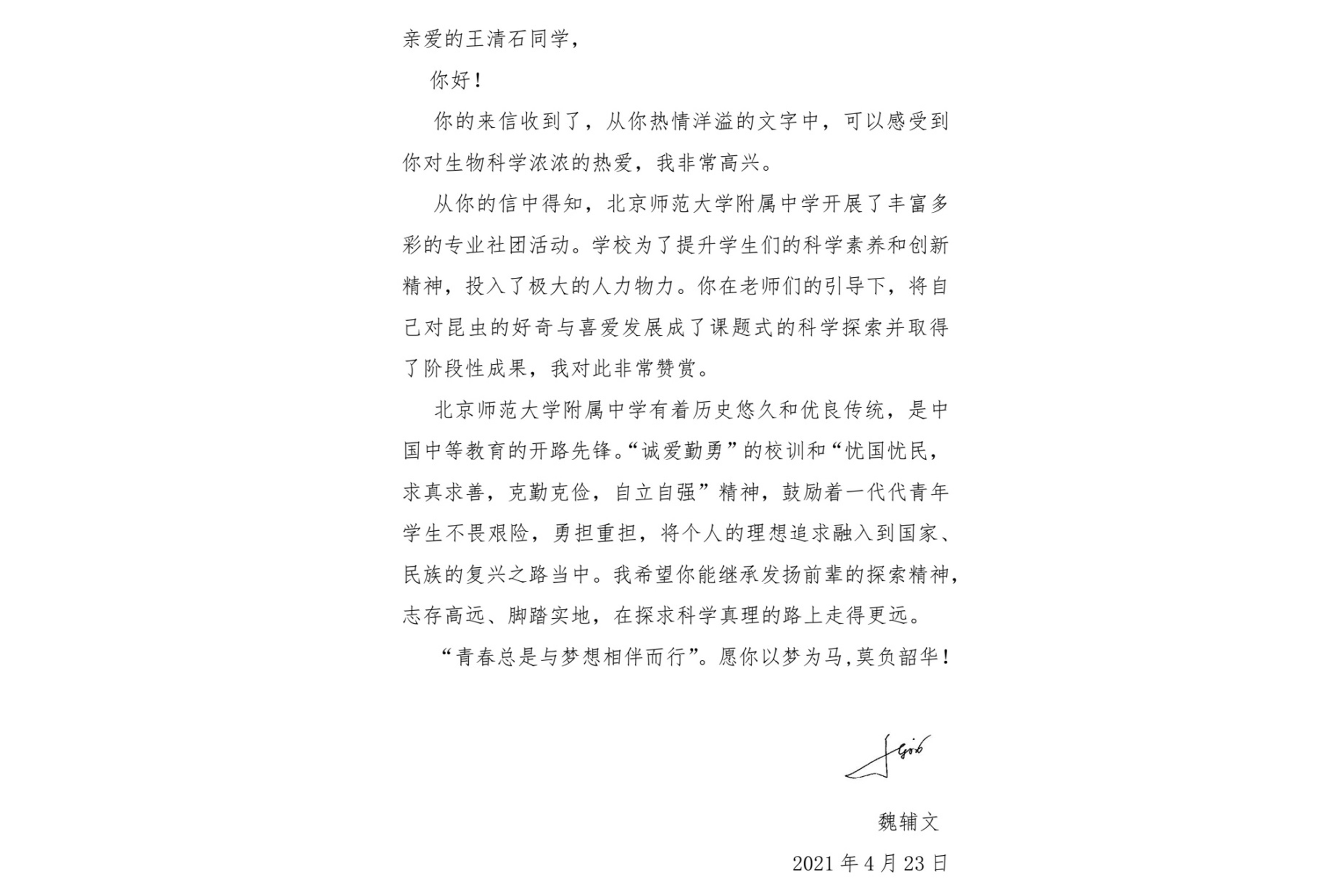 魏院士给王清石同学的回信