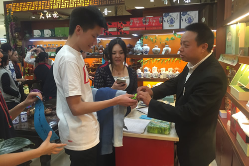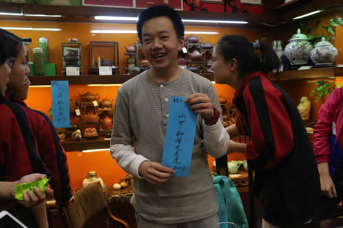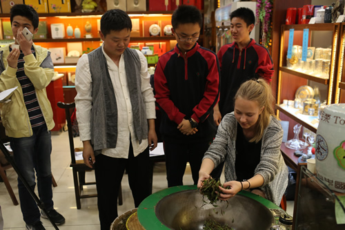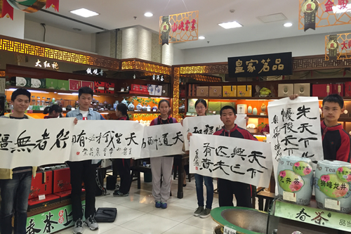 活动共分为四个部分:第一部分是“趣味茶谜”,学生们积极竞猜关于茶艺的谜语。第二部分是“品茶论道”,学生们品尝由程楚龙同学和他的家人冲泡的山峡云雾绿茶、水仙乌龙茶、金骏眉红茶。在过程中程楚龙的父亲给同学们讲解关于茶叶的基本知识,品茶的技巧与方法。第三部分是“现场炒茶”展示,学生们亲身参与西湖龙井的制作过程。第四部分“书法留念”,学生们向书法家何平原先生求得墨宝,为自己私人订制喜爱的人生格言。在这样一堂别开生面的社会实践课中,同学们近距离的感受茶艺、书法等中国传统文化的魅力。
