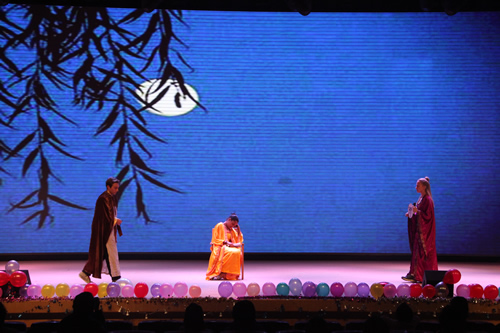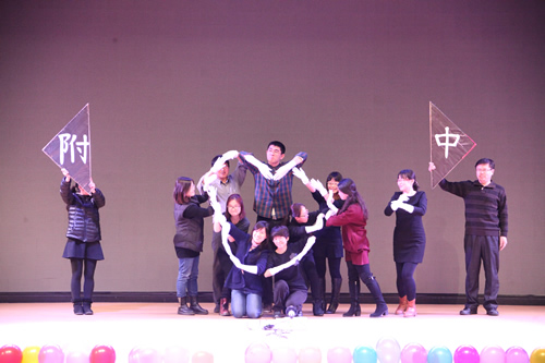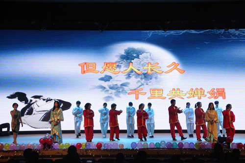 交流中心今年别出心裁,为大家上演了一出唐诗宋词的视觉盛宴。三位来自欧美的留学生把《春晓》和《登鹳雀楼》演绎得惟妙惟肖,让大家不觉自失在唐风宋韵中。由六位身着旗袍的美女教师演唱的《但愿人长久》,在交流中心全体师生的太极拳表演衬托下,把晚会推向了一个小高潮。