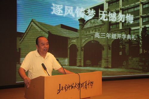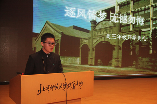 王莉萍校长首先致辞,鼓励同学们珍惜高三、享受高三。特级教师胡朗先生代表全体教师介绍了自己执教高三的体会,并与同学们分享了对高三拼搏的理解。 典礼上播放了同学们精心录制的视频,表达了大家对今昔梦想的解读,和对高三新学年的期望。学生代表王子峥同学激情洋溢的演讲表达了努力拼搏、实现梦想的决心。最后,各班同学在班主任的带领下喊出了努力拼搏的口号。在响遏行云的宣誓声中同学们信心满满、斗志昂扬地开启了高三生活。