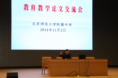 2014年11月2日,无关键词第113个校庆日,一年一度的“教育教学论文交流会”在附中百年会堂举行。大会由教学教研处冯健主任主持,会议首先公布了本年度论文评选结果,此次共评出一等奖7篇,二等奖32篇,三等奖38篇,鼓励奖24篇。王莉萍副校长宣读了获奖名单,刘沪校长为获奖教师颁发证书。在论文交流阶段,张鹏老师总结了自己在班主任工作中的思考与成长;潘星樾老师结合学生在中考作文中出现的问题,借鉴写作心理机制,阐释了写作教学的教学策略;刘松伟老师系统地介绍了有关“支架问题”的研究,并从促进学生思维发展的角度谈及了自己的认识与反思;施小茜老师从学习力课题研究的角度,系统地介绍了数学学科组在学习力要素中的研究工作,以及在实际工作所展开的一些积极探索。随后,科研室郑一丹老师对于教师们所提交的论文做了总体分析,指出项目研究对于教师专业发展的重要作用,并谈及了自己对于论文撰写等问题的认识与体会。最后,刘沪校长讲话,充分肯定了我校所取得科研成绩——生物组的“中学生命伦理学课程的开发与实施”荣获2014年度国家级基础教育教学成果二等奖,以及我校荣获北京市科研先进校的荣誉称号,刘校长认为我校的科研水平有着整体性的提高,并鼓励广大教师,多读书、多思考、多动笔,以项目研究带动教师队伍素质的整体提升,进一步提高我校的教育教学质量。