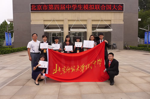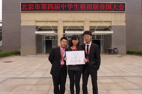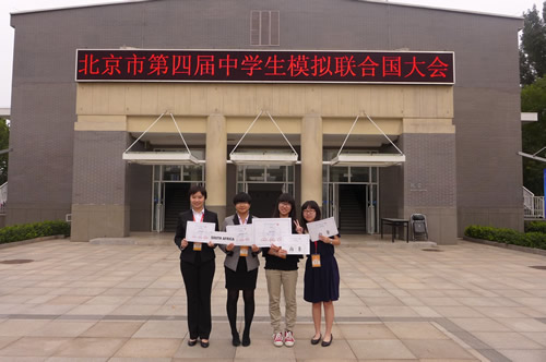 9月12日至14日,在吴士坤主任、刘静老师带领下,我校模联代表团(共7名同学)参加了2014年第四届北京中学生模拟联合国大会,外交部新闻司副司长华春莹女士出席了开幕式。此次会议共有来自北京地区69所示范高中的300多名优秀中学生代表参加,分别在5个委员会展开讨论。我校代表团代表南非参加了两个委员会的会议和地球村活动,还有三位同学分别担任了两个委员会的主席。在三天的会议中,我校的代表们与来自北京各地的学生就国际热点问题进行了辩论、磋商及合作,最终形成决议。