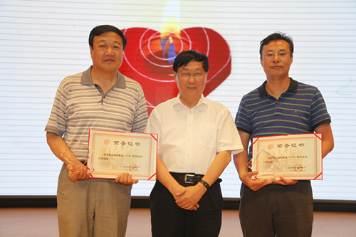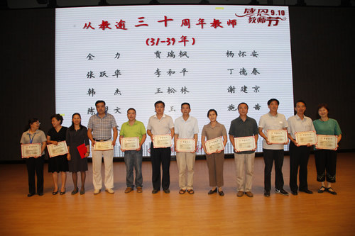 在行进篇中,大会从学生眼中的教师、教师从教感言两个角度介绍了从教十周年、二十周年、班主任任职逾二十周年和从教逾三十周年的55名教师。刘沪校长等校领导为他们颁发了荣誉证书和从教纪念章。本次大会颁发的纪念章系列,从新入职的“新芽吐绿”,到从教10周年的“亭亭如盖”、从教20周年的“花开正红”,到班主任任职逾20周年的“大爱丹心”、从教30周年的“硕果累累”,再到从教40周年及以上的“桃李天下”记录了一个以爱育爱的教育工作者职业生涯的发展轨迹。大会上,学生充满爱的语言温暖着每一位老师,与会教职工发自内心的真诚的掌声感动着每一位登台的老师。在我校从教逾40年的三位教师——刘沪校长(从教43年)、胡朗先生(从教44年)、王天开老师(从教46年)的登场则是将大会推向了最高潮。一位校长、两位特级——这是他们四十多年默默坚守和不懈努力的荣耀见证。化学特级王天开先生一席“我以后改名王和蔼”的从教戏言和物理特级胡朗先生的“只要附中需要,我一定努力做好!”的朴实话语,展现出德艺双馨的特级教师矢志从教追求卓越的感人境界,感染和激励着后来者。