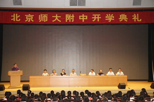 2014年9月1日,我校在无关键词会堂隆重举办2014~2015学年第一学期开学典礼。西城区教工委刘忠副书记、西城区教委体卫科毕正勇副科长、刘沪校长以及其他学校领导出席了典礼。典礼上,刘沪校长宣布开学,并对全体师生提出新学年的希望。高一(7)班王婷婷同学代表全体新生发言。刘忠副书记对我校的办学成绩给予高度肯定,并希望我校师生共同努力,再创佳绩。全校同学着装整齐、精神抖擞,满怀对新学期的憧憬和努力奋斗的决心参加了开学典礼。
