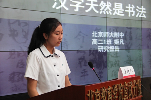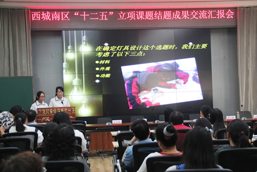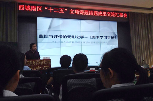 2014年5月22日我校段超老师,在北京教育学院宣武分院二部召开的西城(南)区“十二五”立项课题结题成果交流汇报会上做科研课题结题汇报。段超老师以课题负责人的身份代表整个课题组做题为“监控与评价的无形之手-----《美术学习手册》”的报告,我校高一8班曲悦、高二1班姬凡、高二2班宋好雨、高二4班权玉蓉同学及现就读于中国传媒大学的校友郭旭铮同学也在会上做了展示和汇报。段超老师的报告和同学们的展示获得了与会的专家、领导们的一致好评。