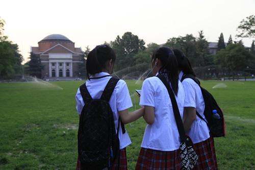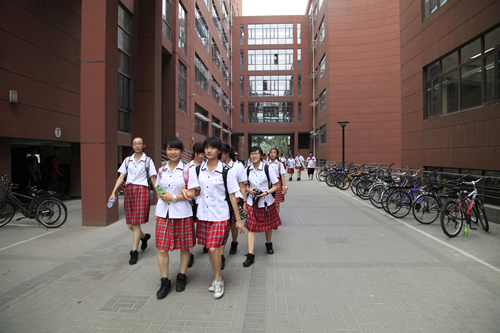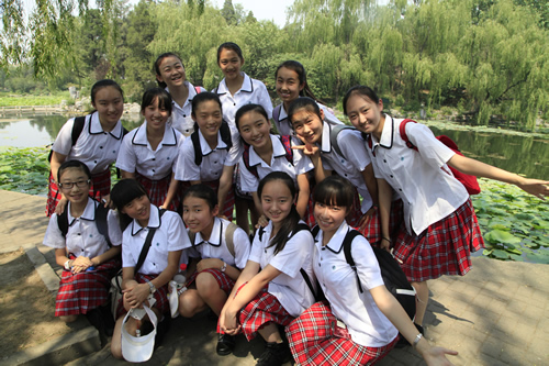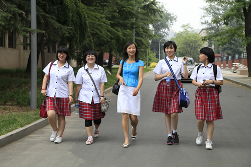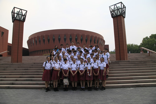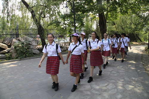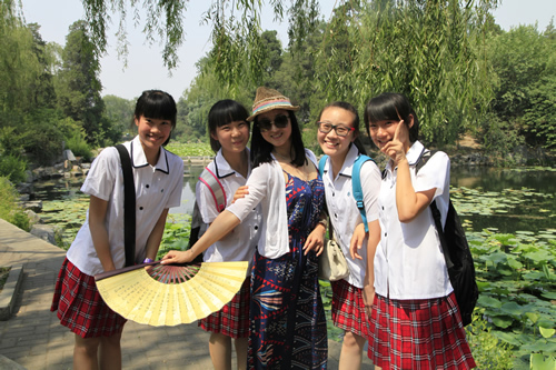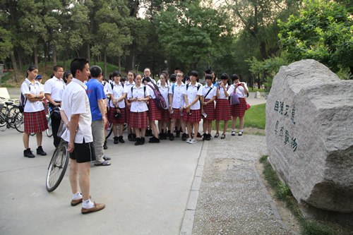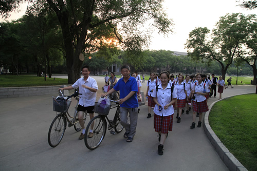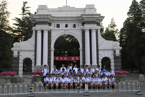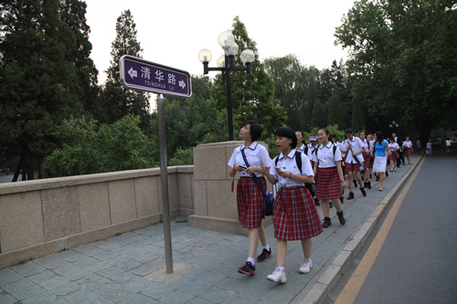 去年考入清华大学的段佑璇、孙嘉懿同学在繁忙的复习应考中挤出时间带领同学们参观了美丽的清华校园。在古朴的清华老校门下、在肃穆的清华会堂前、在雕刻有“行胜于言”的日晷边、在书写有“自强不息,厚德载物”的校训石旁,在朱自清先生笔下著名的荷塘边,同学们感受着这所百年名校的特殊的美,体味着她的历史与传统。尽管是入夏以来北京最炎热的一个下午,大家仍精神十足,兴致勃勃。舞蹈团同学说清华的精神激励我们应该奋发图强、团结协作、争创一流。