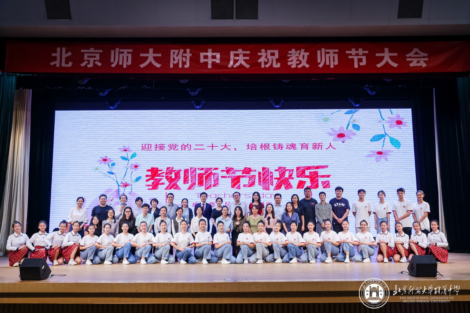 9月8日,北京师范大学迎来一百二十周年华诞,一个月后,党的第二十次全国代表大会将在北京召开,在这样的时间节点,附中教师节的庆祝大会以附中合唱团充满爱意的歌曲《爱你》中开始,以金帆舞蹈团极具青春活力的《天天向上》落幕。附中的全体教师将继续不忘初心,不负使命,立德修身,躬耕前行,努力成为党和人民满意的“四有”好老师,在三尺讲台上发光发热,为培养德智体美劳全面发展的社会主义建设者和接班人贡献力量。