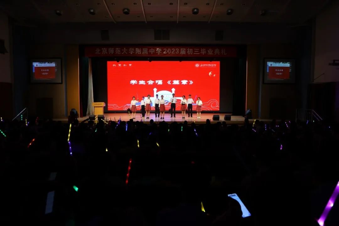几代青年,皆以梦为马,不断探索中国的未来,而今天的我们,生逢盛世,当不负时代。校园十强歌手为初三毕业生带来歌曲《篇章》。附中的会堂亮起一支支挥舞的荧光棒,观众席升起了一片灿烂的星海。嘹亮的歌声激励着学子们在人生的新篇章里不畏艰苦,勇敢拼搏。