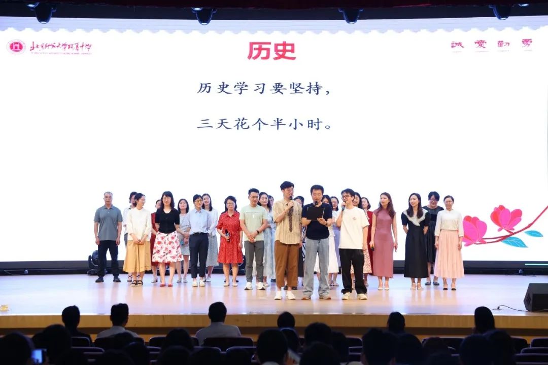 “今天毕业齐欢聚,我们老师来叮嘱。各个学科齐亮相,真酷!”初三年级全体老师为学生们带来节目《我们的学科》。以幽默诙谐的三句半,向学生表达着那份不舍的爱与祝福。