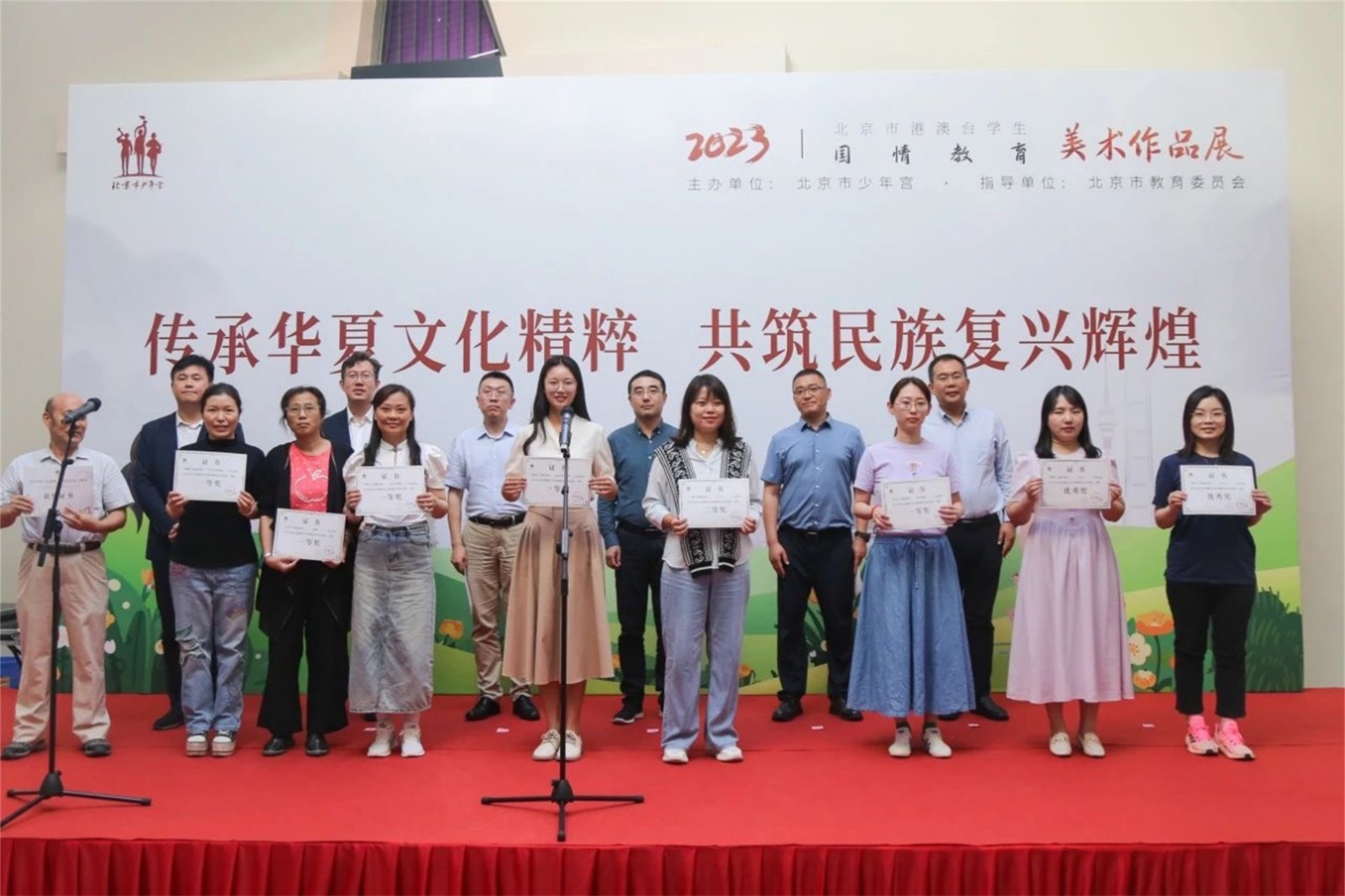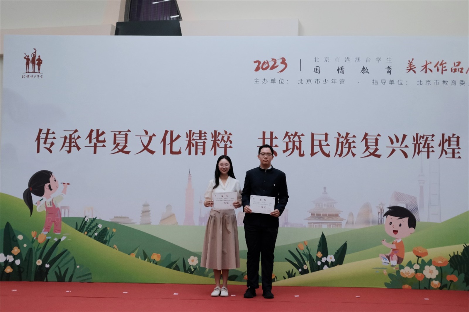 9月22日下午,由北京市教育委员会指导、北京市少年宫主办的 “传承华夏文化精粹 共筑民族复兴辉煌”—— 北京市港澳台学生文化体验、美术作品展活动开幕式在北京市少年宫隆重举行。我校获奖学生代表何冠泽同学和活动指导教师赵雪杉受邀参加了此次作品展活动开幕式。