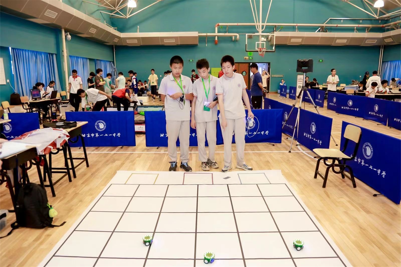 初二年级孙博航、黄文韬、赵泊岩三位同学比赛现场调试创意机器人