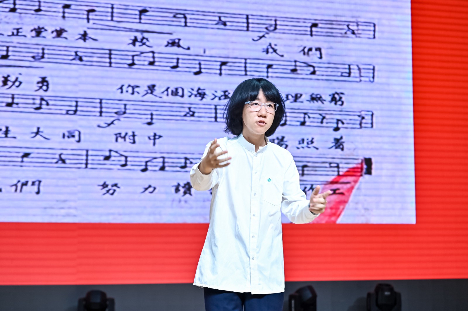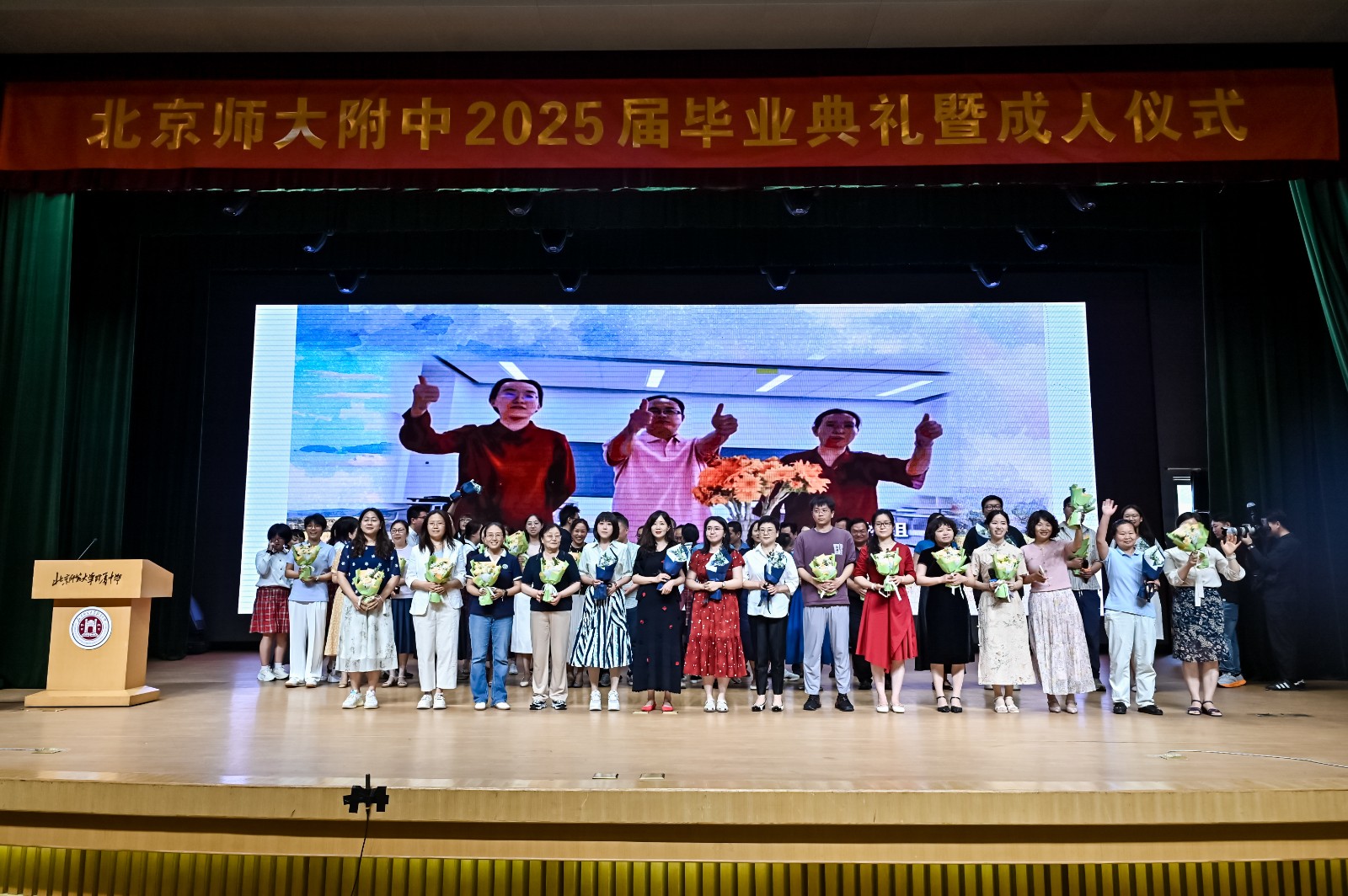 接下来,大屏幕播放了高三教师们 18 岁的青葱照片与近照对比。岁月在他们的脸上留下了痕迹,但不变的是那份教育的初心。带着这份初心,高三老师们为所有毕业生送上歌曲《希望你被这个世界爱着》。那悠扬的歌声,如同温暖的怀抱,传递着对学子的不舍与祝福。毕业生们则为老师献上鲜花,一声声“老师,谢谢您”发自肺腑,让许多师生红了眼眶。