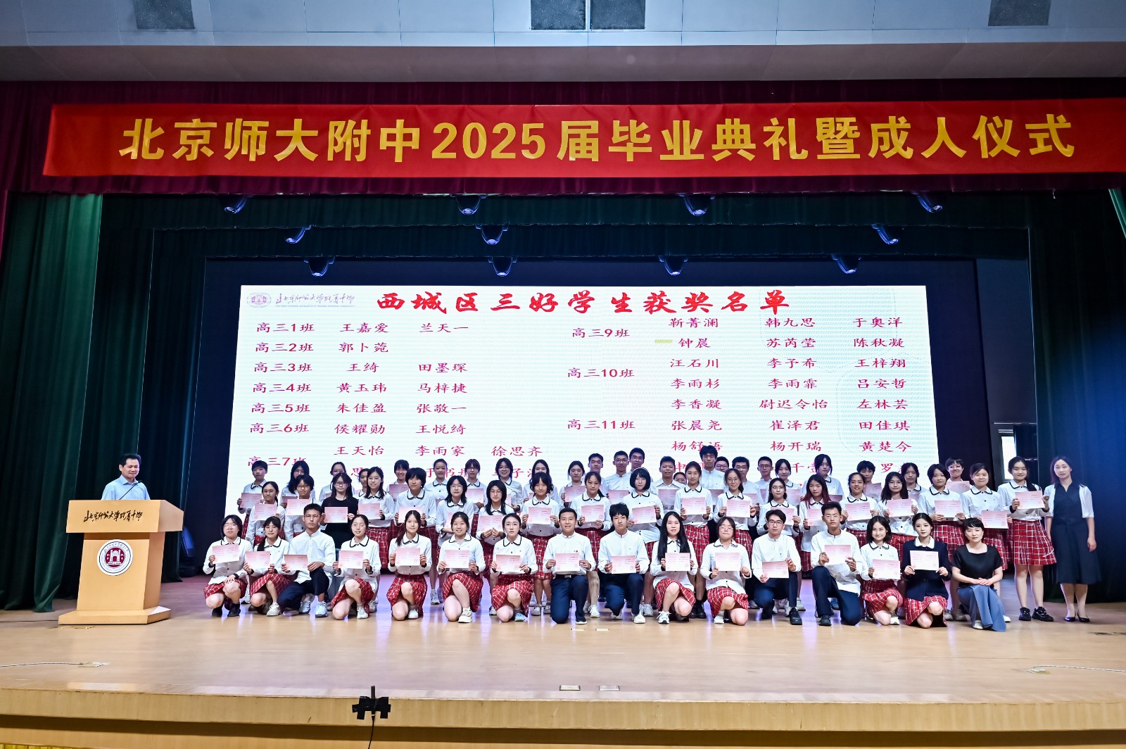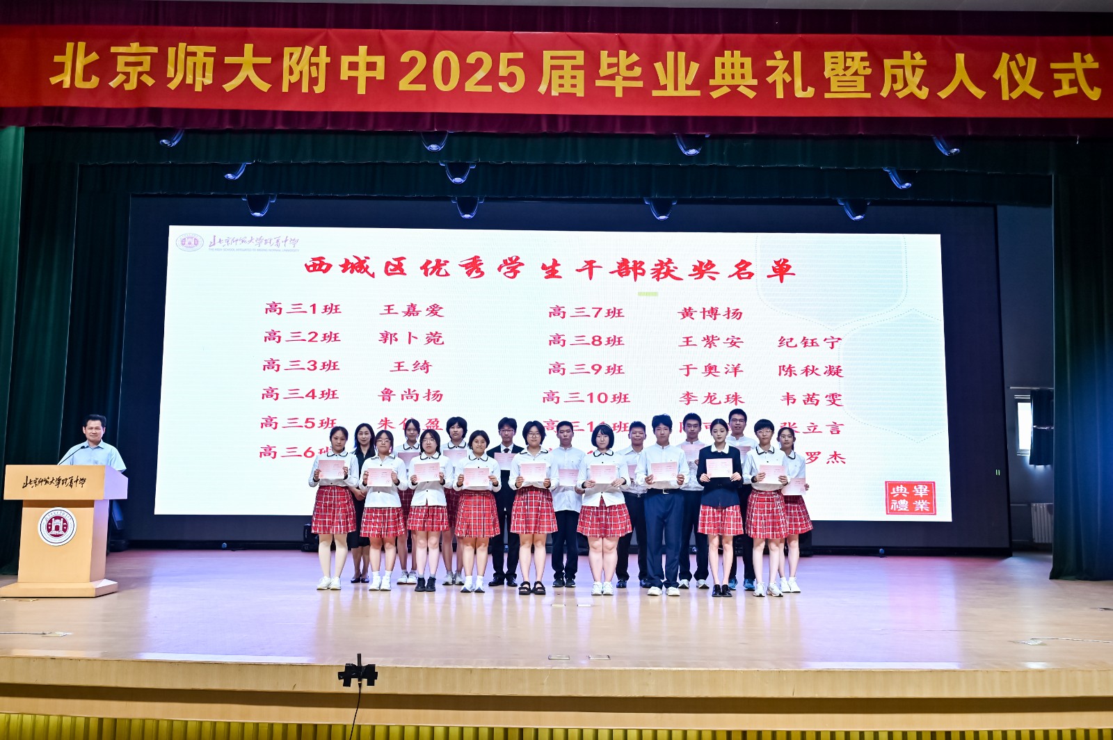梁原草副校长宣读了市区级三好学生、优秀干部及先进班集体名单。校领导为获奖者颁发奖状,表彰他们在学业、品德与集体活动中的卓越表现。这些荣誉,是对他们努力的最好褒奖,也是激励他们在未来不断进步,成为更好的自己。