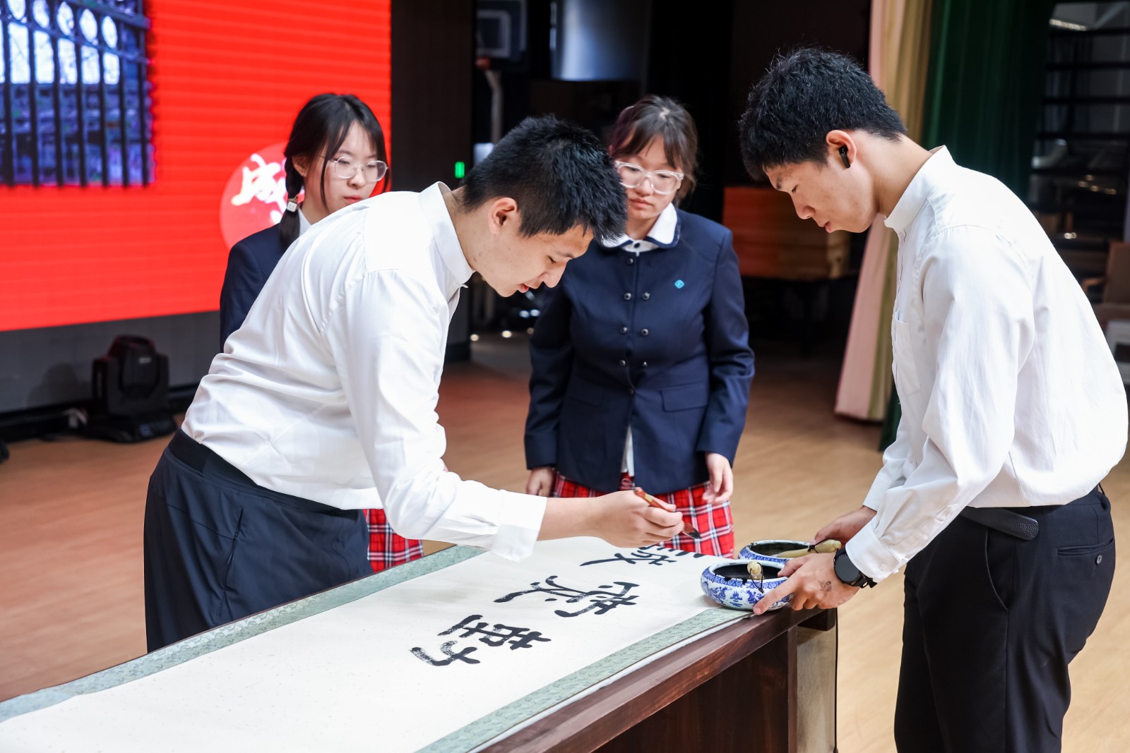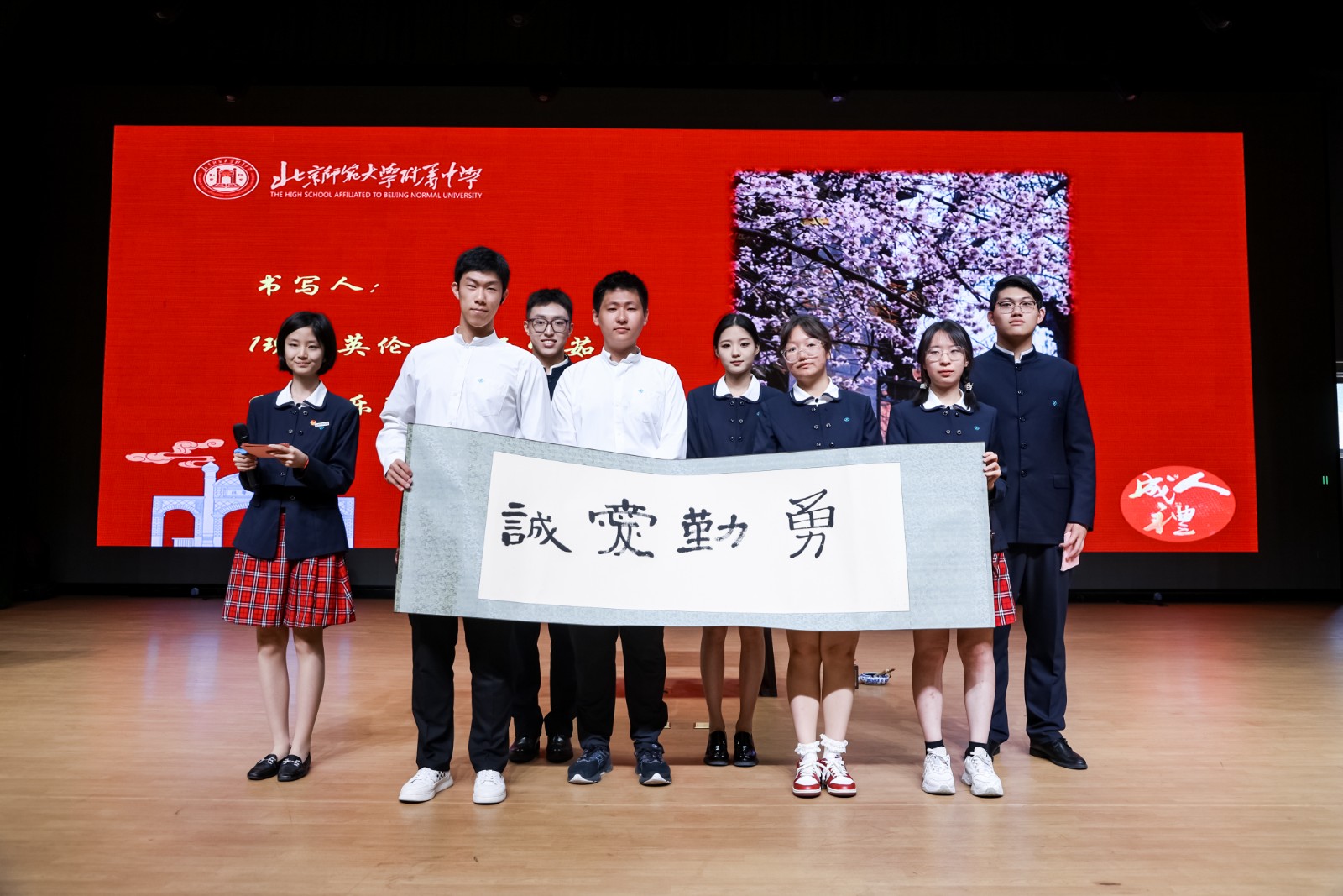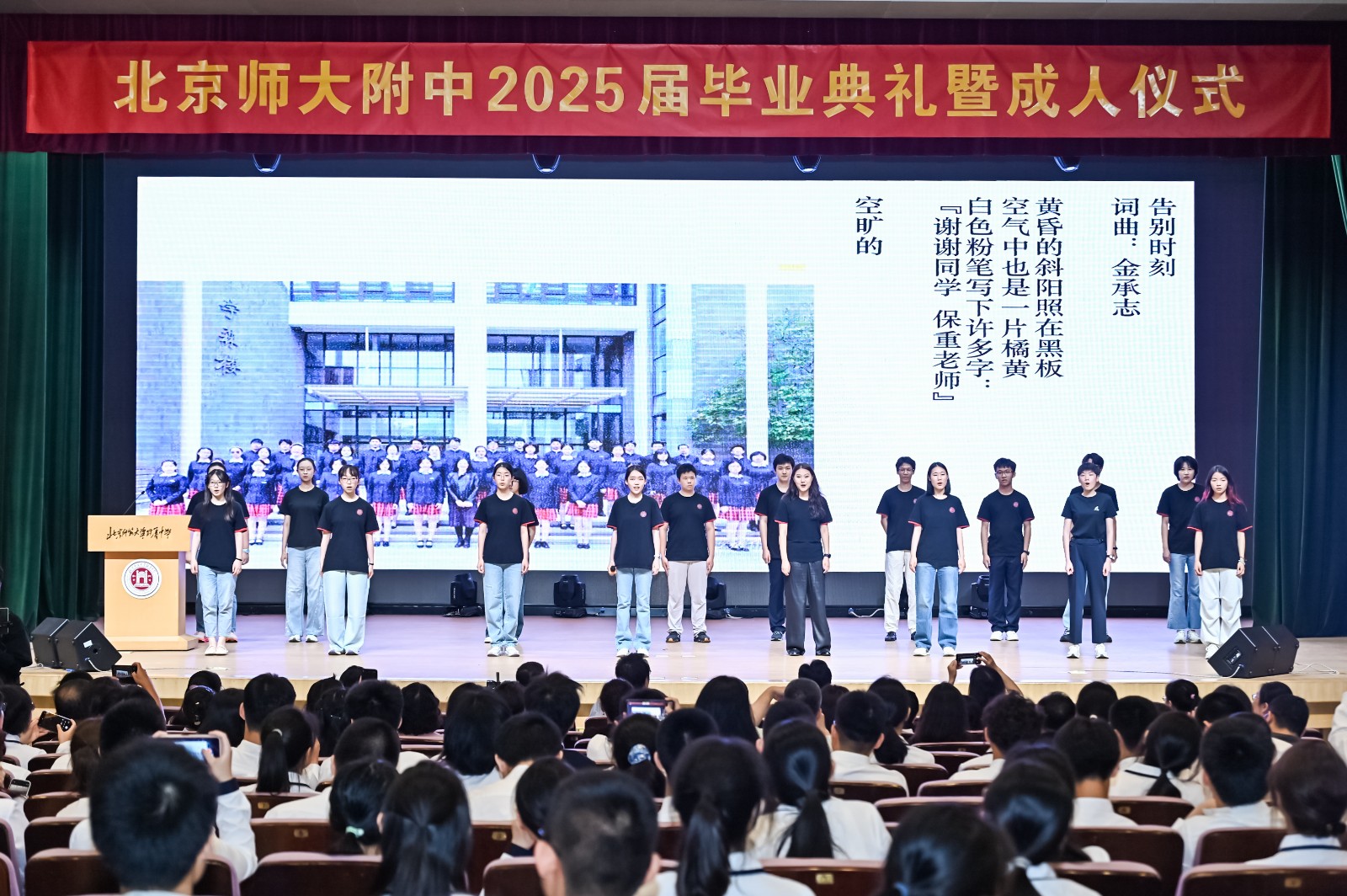 最后,全体师生齐唱校歌,毕业生代表上台书写校训“诚爱勤勇”。熟悉的旋律承载着无数回忆,书写的过程则寄托着对未来的无限期待。2025 届毕业典礼暨成人仪式虽然结束,但青春的故事永不落幕,学子们将带着附中的精神烙印,奔赴山海,共赴时代之约,去书写属于自己的辉煌篇章。