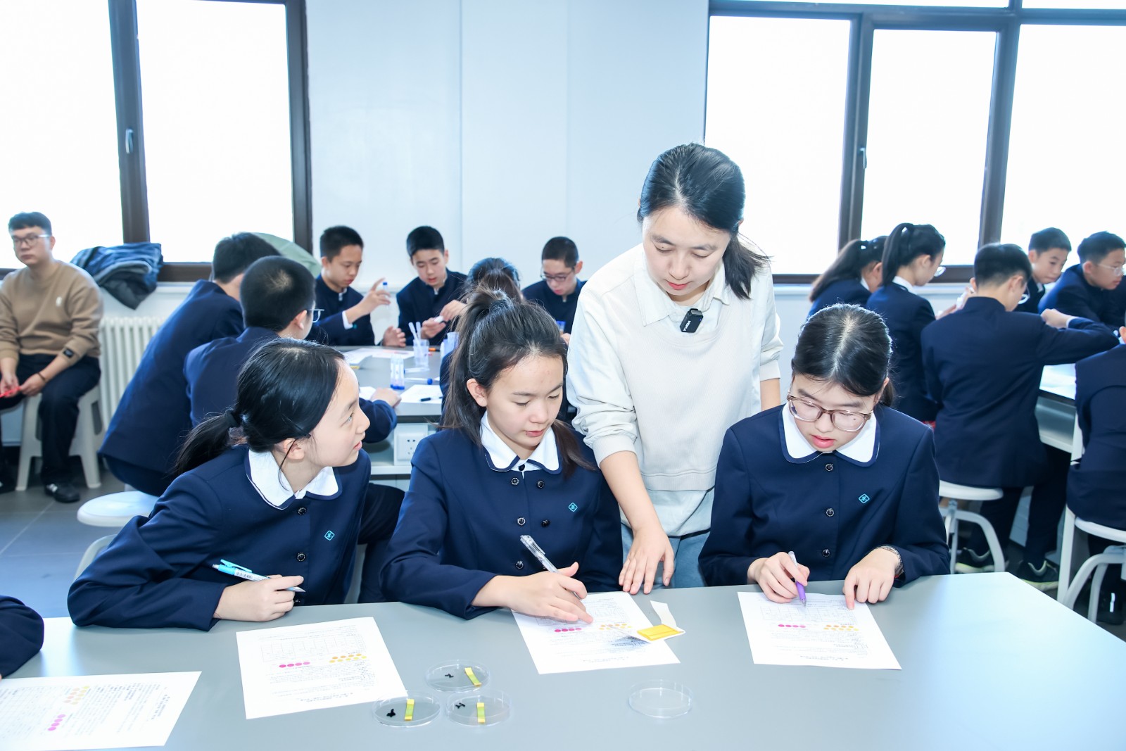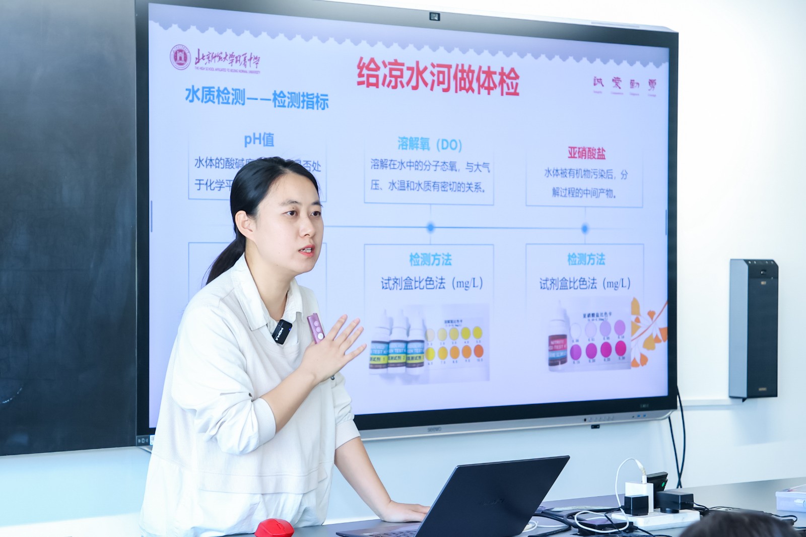 侧理组陈婧老师的研究课《追踪城市的水密码——给凉水河做体检》中,学生将实地调研成果带回课堂,从人文设施、生态环境、水体健康三个维度进行汇报。水质检测后,结合调研成果、地理位置与人类活动等方面分析,综合评价凉水河健康状况,探讨人类活动与水体健康的关联。