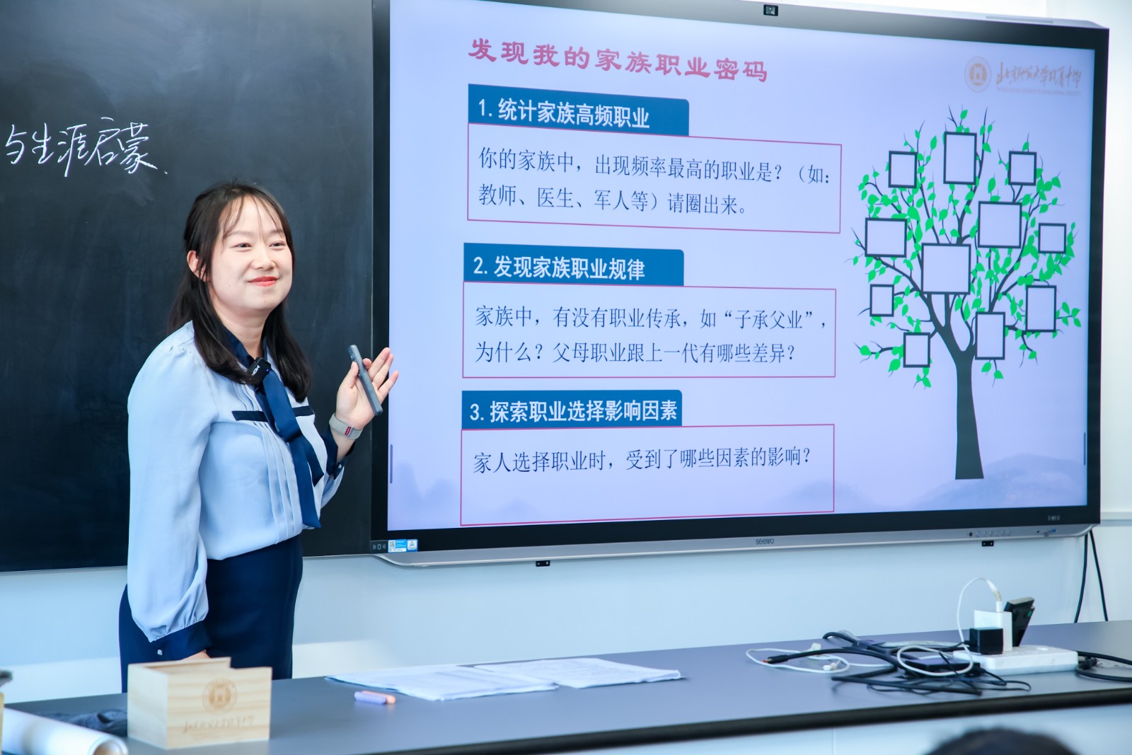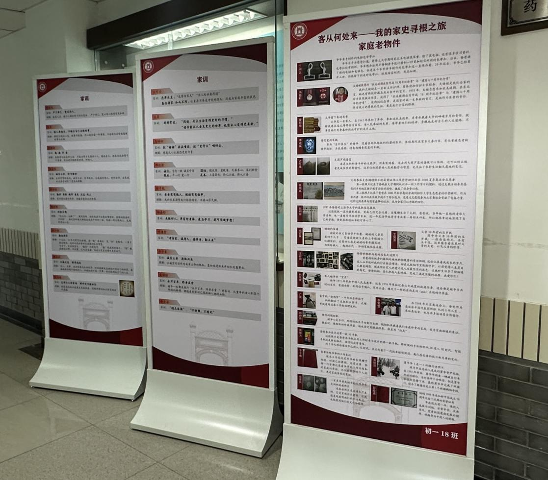 侧文组胡蝶老师的《客从何处来-我的家史寻根之旅》围绕家史调查展开。学生通过家族访谈,了解家风家训,以及家庭老物件背后的故事,把走廊布置成“家史博物馆”,同学们浸润其间,仿佛穿梭于家族记忆长廊。教师通过“家族职业故事分享”“生涯冥想”等活动,引导学生发现家族职业密码,感受亲情支持,把个人成长与家国情怀紧密相连,生动诠释了“知来处,明去处”的课程深意。