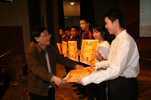 4月3日下午,我校在礼堂举办了“唱响国歌”高一年级歌咏比赛。这次大赛由高一年级组和校团委联合主办,是本届“青杉”艺术节的又一项重大赛事,也是为迎接北京奥运会而开展的一项爱国主义教育活动。比赛要求必须演唱一首国歌或者校歌,另一曲目自定。担任评委的有艺术组齐宏老师、张秀玲老师、陈卓老师以及冯希奇老师。高一9班以精彩的演出获得一等奖;高一6班和11班获二等奖。赛后,齐宏老师做了点评;刘沪校长和王玉清校长为获奖的班级颁发了奖状。