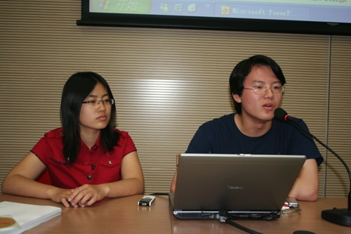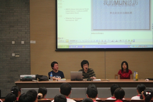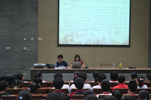 此次“模联”活动中,北京大学“全国中学生模拟联合国大会”组委会的工作人员 孙露和冯宇辰向大家介绍了“模拟联合国大会”的组织结构、活动形式、国际影响等诸多方面。特别是去年刚从我校毕业,曾是我校“模联”的主力成员,现为北京大学“模联大会”负责人的冯宇辰同学,以其亲身经历,讲述了参加模联活动使他更加关注国际事务,从中认识复杂的国际关系,了解和平解决争端的机制,培养外交谈判和达成共识的能力,同时使自己更加富于正义感、使命感……。我校应届高三毕业生,上届“模联”的主要成员,现已被美国圣乔治?华盛顿大学录取,并获得“美国总统奖学金”的刘晨飞同学,也以“过来人”的身份,向学弟、学妹们介绍了参加模联活动给他人生带来的变化,“模联”的经历大大开拓了视野,提升了能力,同时这段经历也帮助他顺利考取了美国大学,并获得奖学金。