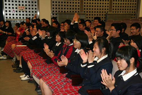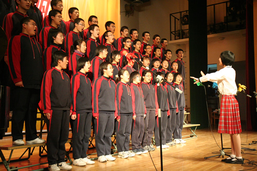 高一(2)班的《让世界充满爱》,曲调优美,声音和谐,吸引了不少同学在台下跟着轻轻吟唱;高一(7)班的《掀起你的盖头来》,和声高低错落有致,显示了高超的合唱水平;高一(10)班的《保卫黄河》气势磅礴;高一(8)班的《哆来咪》欢快美妙……