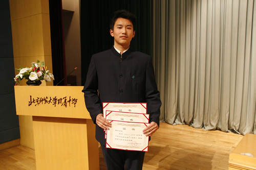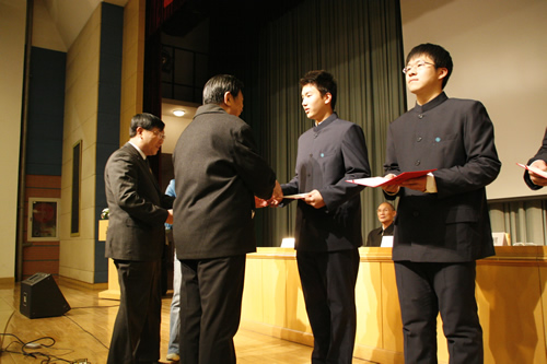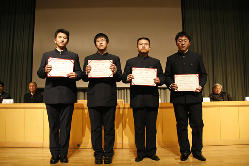 2008年12月22日下午,“尚兴久奖学金”设立暨首次颁奖仪式在无关键词会堂隆重举行,“尚兴久奖学金”管理委员会成员及全校师生2000余人参加了颁奖仪式,刘沪校长在会上致辞并向获奖同学颁奖。现高二、高三年级共4名学生获奖。其中梅松同学成绩突出,获北京市数学、物理、化学竞赛一等奖,且物理竞赛成绩为北京市第二名,共获得三项奖学金,合计九千元。