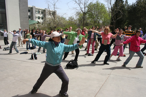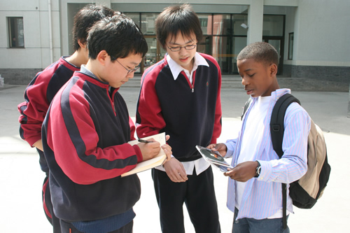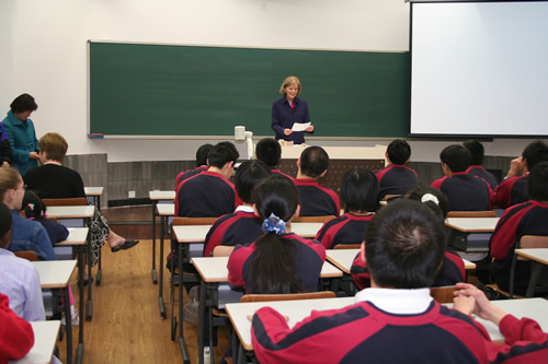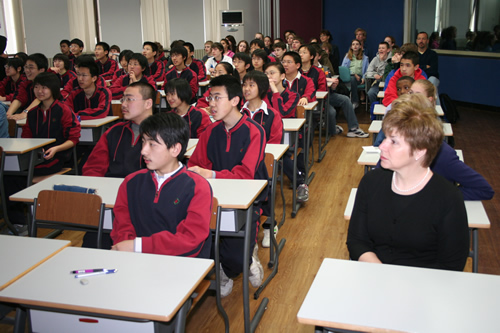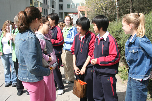 4月13日上午,友好校美国密西根州伯明翰学区德比中学访问团来我校参观交流,访问团成员共六十余人,包括学区副总监、校长、教师、学生和学生家长。美国客人在我校参观校园、学太极拳,并在高一11班的英语课上与我校同学进行了极为热烈友好的交流。刘沪校长与来访的学区总监和校长就进一步开展两校师生间的友好交流问题进行了深入的磋商。