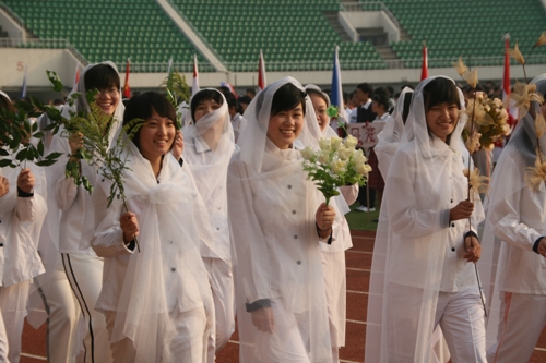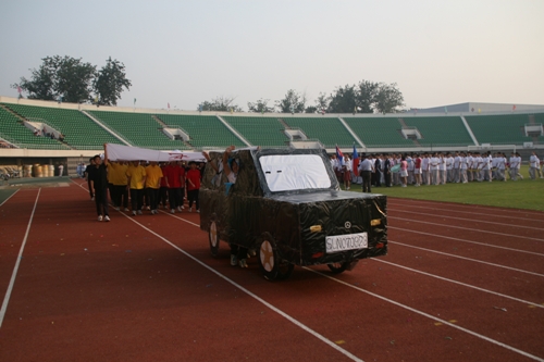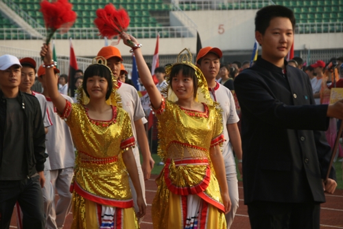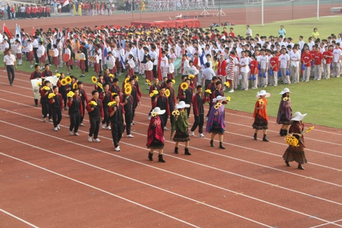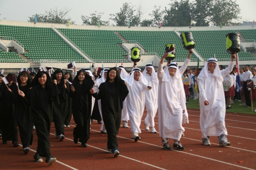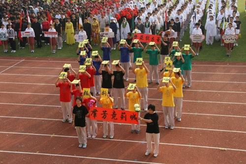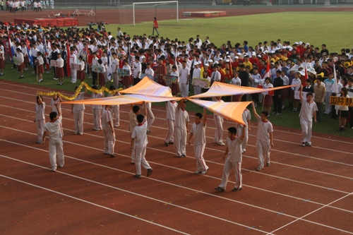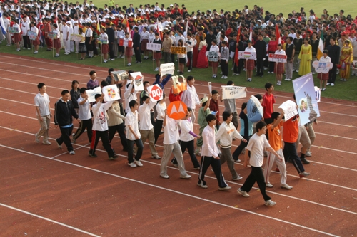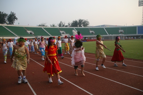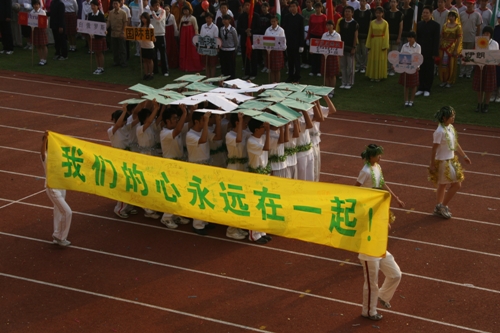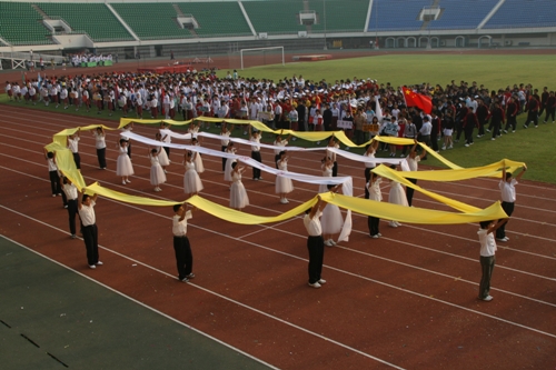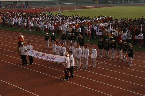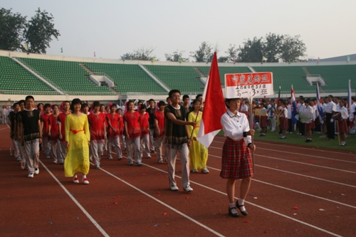 这次运动会模拟奥运会入场的新颖形式让同学们对世界和平友好、对奥林匹克精神有了更深的认识和理解。入场式上,每个班级代表一个国际奥委会成员国家或地区。同学们身着各个国家或地区的服装,手擎各国国旗、展示牌,用新颖的队形、响亮的口号、良好的精神状态展现出附中人的活力与风采,博得了在场国际友人和区领导的高度赞扬。尤其当高一(3)班同学身穿“奥运同心结”结对国家印尼特色服装,女生头戴工艺绢花,男生手握羽毛球拍朝气蓬勃的入场时,主席台上响起了热烈的掌声。