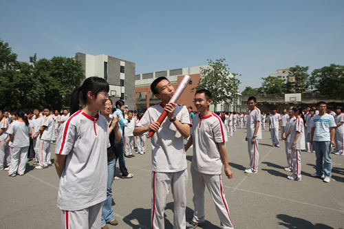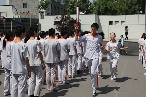 为传递奥运激情与梦想,承载附中师生对灾区同胞的牵挂、支持与关爱,无关键词今天上午利用升旗仪式的时间举行了模拟奥运火炬传递仪式,由教导处主任况莉老师主持。起跑仪式前,全校师生集体默哀一分钟,以悼念在四川汶川大地震中遇难的同胞。6月2日10时20分火炬传递正式开始,刘沪校长从梁原草副校长手中接过火炬,向学生代表发出“祥云”。随后,由每班选出的三名代表担任火炬手,高举“祥云”火炬在校东区操场上的46个教学班间依次传递。全校师生都切身体会到了火炬传递过程中的热烈气氛。“祥云”火炬不仅承载着和平与光明,更传递着勇气和希望,它将不屈不挠的奥运精神和愈挫愈勇的中华民族精神合二为一,向当代中学生提出希望,要奋发向上自强不息,肩负起振兴祖国的重任。