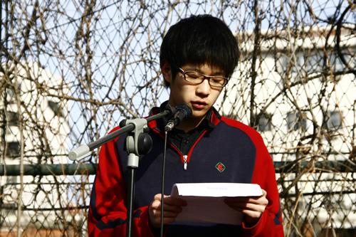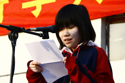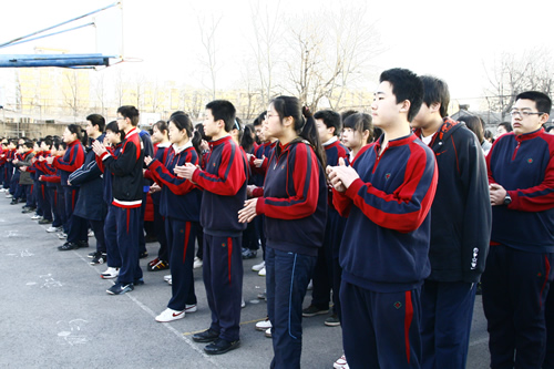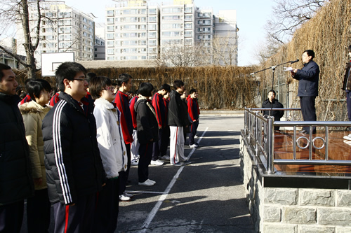 2009年2月16日,在这个略带寒意的早春的晨风中,我校全体师生在操场举行了隆重的开学典礼,迎接新学年的到来。升旗仪式在庄严的国歌声中开始,学生代表高一(6)班贾伊荻同学首先做了热情洋溢的发言。其后刘沪校长发表了新学年致辞,刘校长对08年工作取得的成绩给予了高度的评价,也对学校09年的发展提出了殷切的希望,同学们对刘校长的发言报以了热烈的掌声。