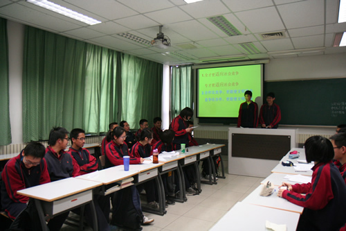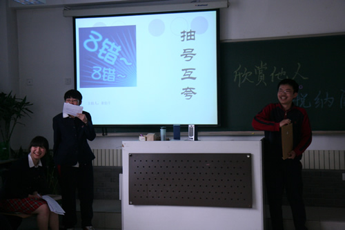 近日,我校高二年级各班举办了“欣赏他人、悦纳自己”主题教育班会。在本次班会中,各班充分发挥本班特长,利用人生寓言、小品、性格测试、访谈、墙报、“夸夸我的好朋友”及“猜猜这是谁”等各种形式的活动,来展示、发现、更深的了解自己身边同学,从而起到团结同学,构建健康向上和谐的班级氛围,及形成正确的待人接物的人身观、价值观和交友方法。高二(1)班的班会中,同学们别出心裁的设计了“评选班级之最”的活动,将气氛推向高潮,各位“获奖”同学,也在同学的积极评价当中,更好的认识了自己的优点与特长。