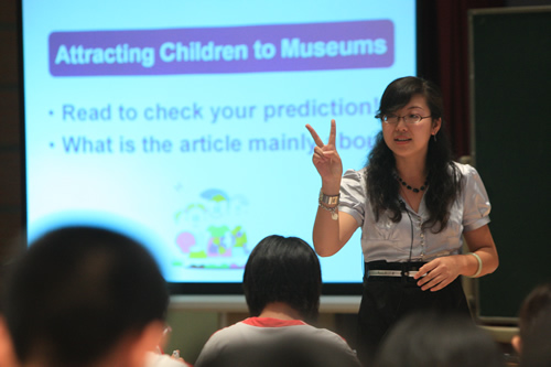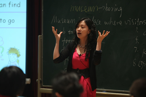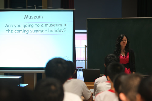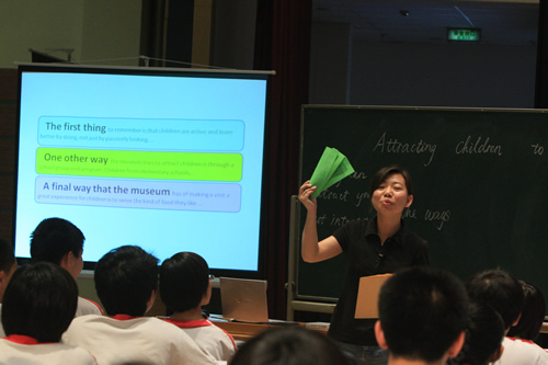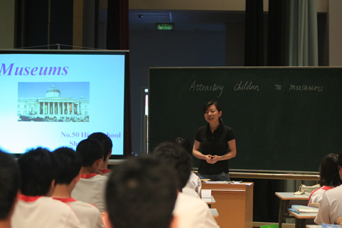 参加6月16日举行的高中组比赛的有北京师大二附中的张晋芳老师,五十中学的商雅梅老师,以及我校外语组张媛媛老师。三位老师就同一材料“吸引孩子到博物馆”,展示出了三堂不同的课。张晋芳老师和商雅梅老师紧扣文章内容,做出了两节阅读课;而张媛媛老师突破传统的英语听、说、读、写课型,以创造性思维为中心,激发学生兴趣,展现了灵活运用英语语言解决实际问题的能力。