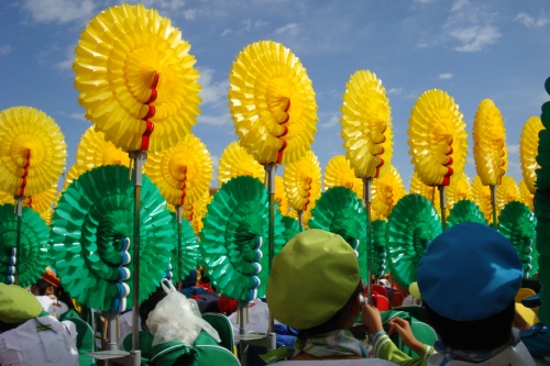 在完成最后一幅组字“中华人民共和国万岁”翻花之后,全场学生向空中抛起帽子高声欢呼:祝福祖国,生日快乐!
