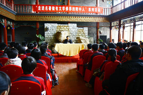 全年级的学生分为两个大组,一组先在红楼礼堂听红学专家周汝昌之子周建临先生的专题小讲座,另一组学生以班为单位在导游的引领下,参观怡红院、潇湘馆、稻香村等重点景点。在讲座之后,本年级的十位学生扮演贾母、林黛玉、贾宝玉、王熙凤等角色,为同学们演出了自排的课本情景剧片段。