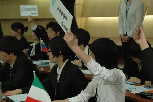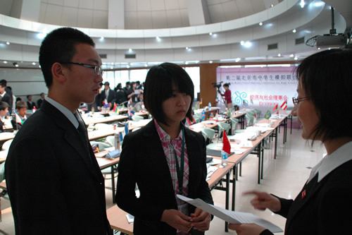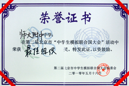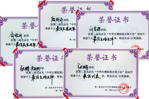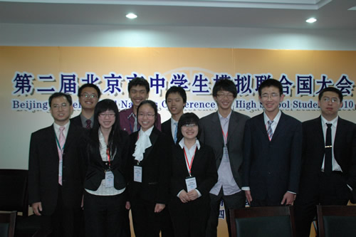 2010年5月15日―5月16第二届北京市“中学生模拟联合国大会”在北京四中举行,这次以环境保护为主题的模拟联合国大会吸引了全市35所示范高中的400多名学生参加,会议上讨论的自然灾害、环境气候以及垃圾处理等当前城市面临切实的问题也让学生们增强了环境保护的意识。我校模联社团是本次大会五个发起学校之一,充分地参与了本次大会的组织报名、背景文件的撰写、立场文件的收集和审阅等环节。在这些过程中,社会团成员锻炼了能力、展示了风采,充分显示了我校和模联社团在北京市的实力和地位。