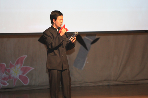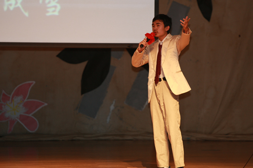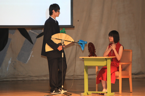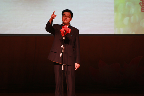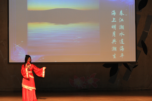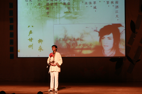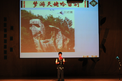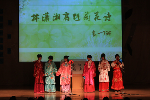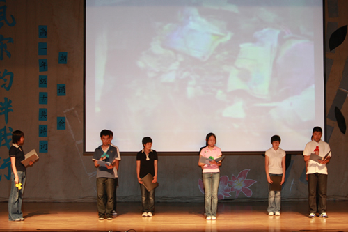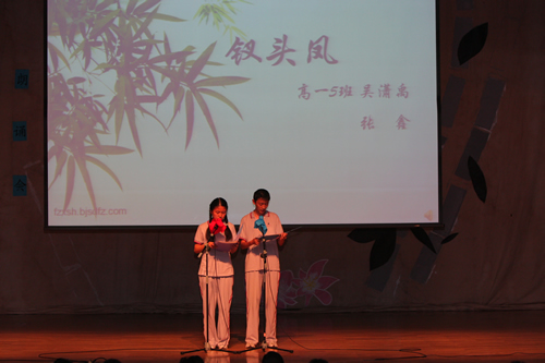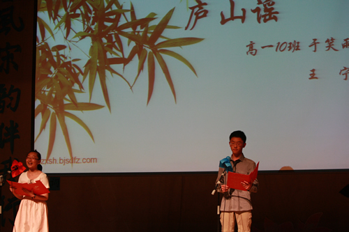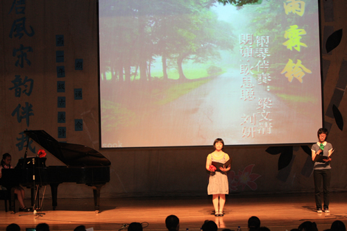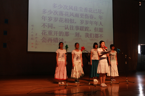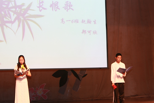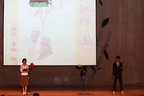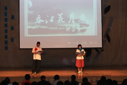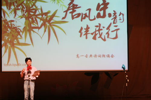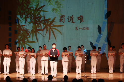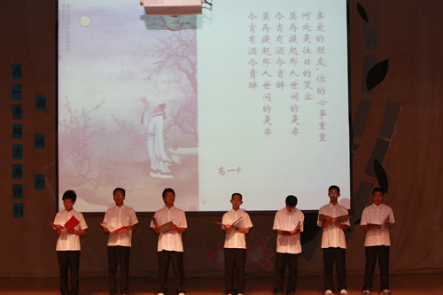 2010年6月8日下午,无关键词高一年级同学在无关键词会堂举行“唐风宋韵伴我行”古典诗歌朗诵会。同学们为朗诵会做了充分的准备,服装道具,配乐背景,精彩纷呈;朗诵更是形式新颖、情感充沛、富有感染力。18个节目紧凑连贯,各具特色,观众时而爆发出热烈的掌声,时而沉浸其中小声跟随吟诵。比赛结束后梁原草副校长做了点评,并与年级组长贾瑞枫老师一起为获奖者颁奖。